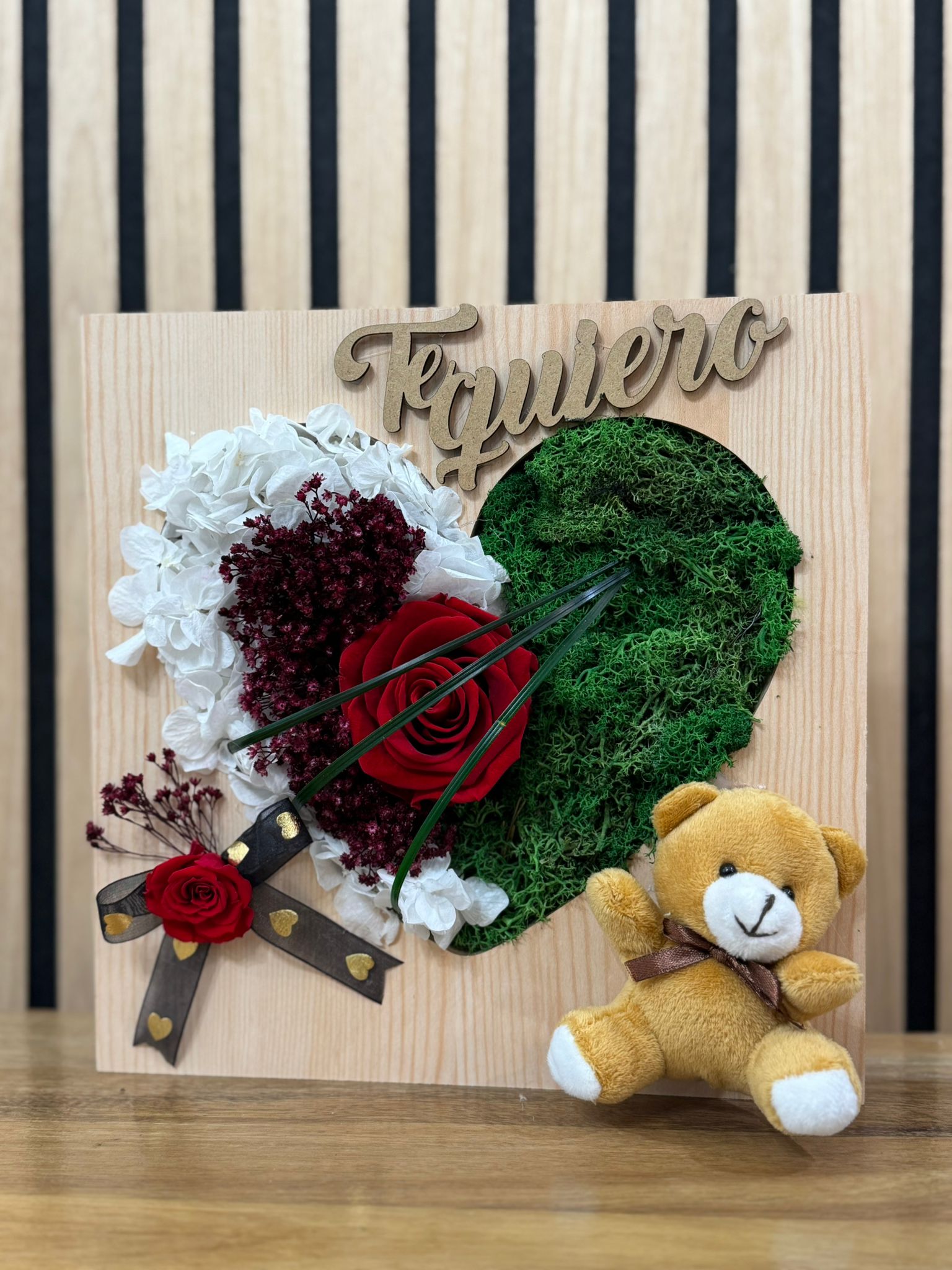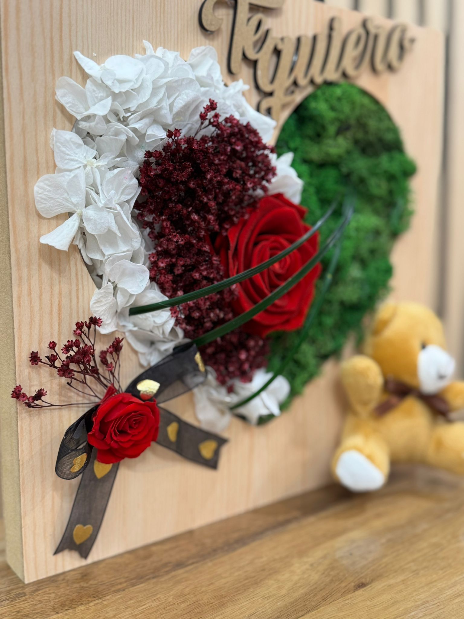 Un regalo único y artesanal en Alcoy. Elegante cuadro de madera con calado en forma de corazón, decorado con una composición de flores blancas y granates, musgo preservado y una rosa roja central. Incluye un tierno oso de peluche y el mensaje «Te quiero» en relieve, ideal para expresar tus sentimientos con el sello de Floristería Rosamary.