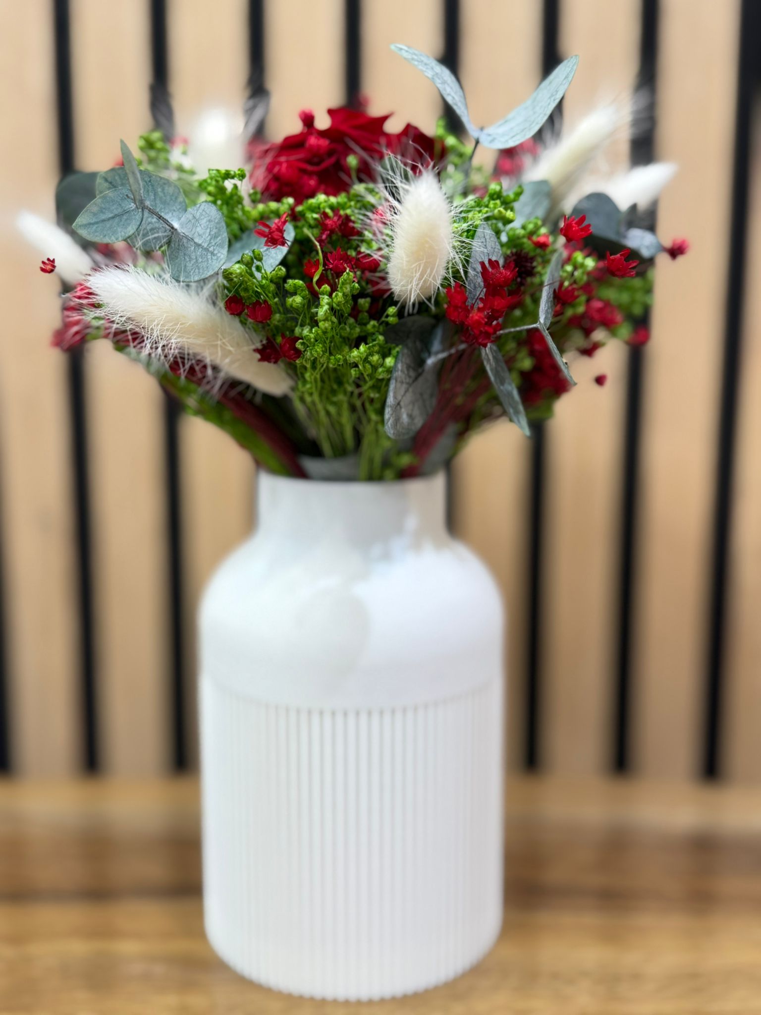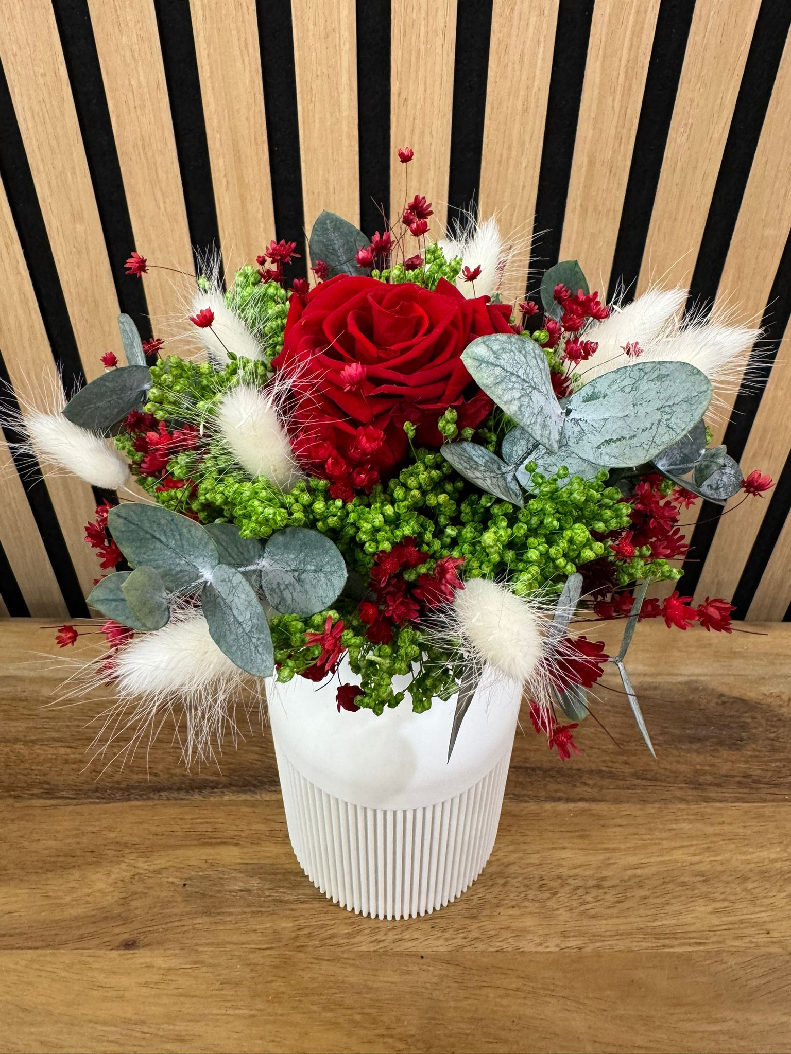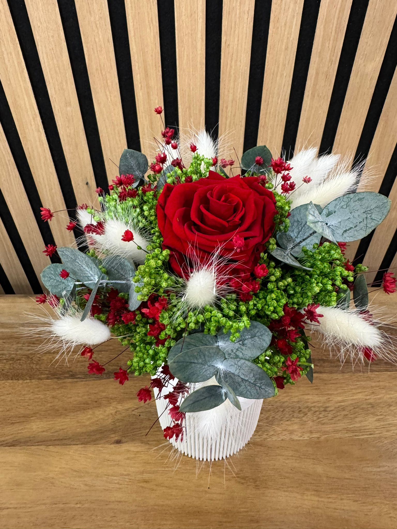 Detalle floral exclusivo en Alcoy. Elegante composición de rosa roja natural acompañada de una vibrante mezcla de verdes, eucalipto y texturas silvestres. Presentado en un jarrón blanco pequeño con diseño cilíndrico estriado, ideal para dar un toque de frescura a cualquier rincón.